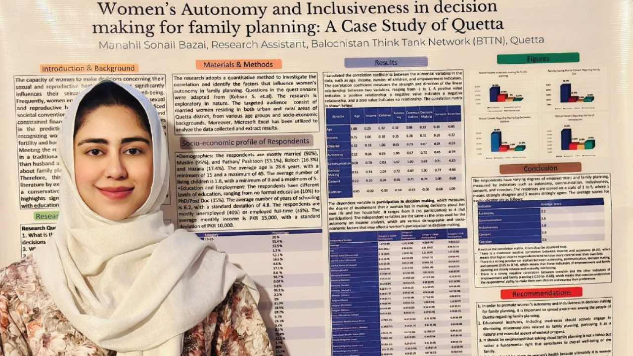 While Ms. Manahil Bazai’s research titled ‘Women’s Autonomy and Inclusiveness in Decision Making for Family Planning: A Case Study of Quetta’ contributed to the existing literature by exploring the extent of women’s autonomy in the conservative societies like in Quetta.