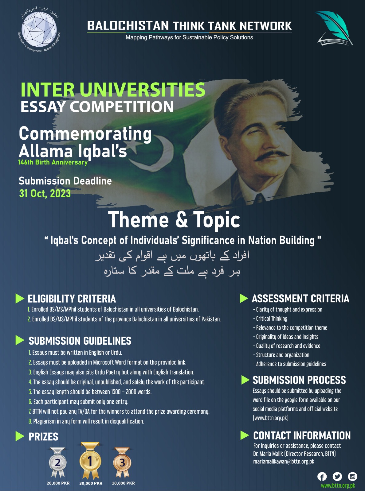Balochistan Think Tank Network (BTTN) is commemorating Allama Iqbal’s 146th Birth Anniversary by organizing a province-wide Essay Competition for the students from Balochistan who are currently enrolled in the BS/MS/MPhil program in any of the HEC recognized Universities of Pakistan.